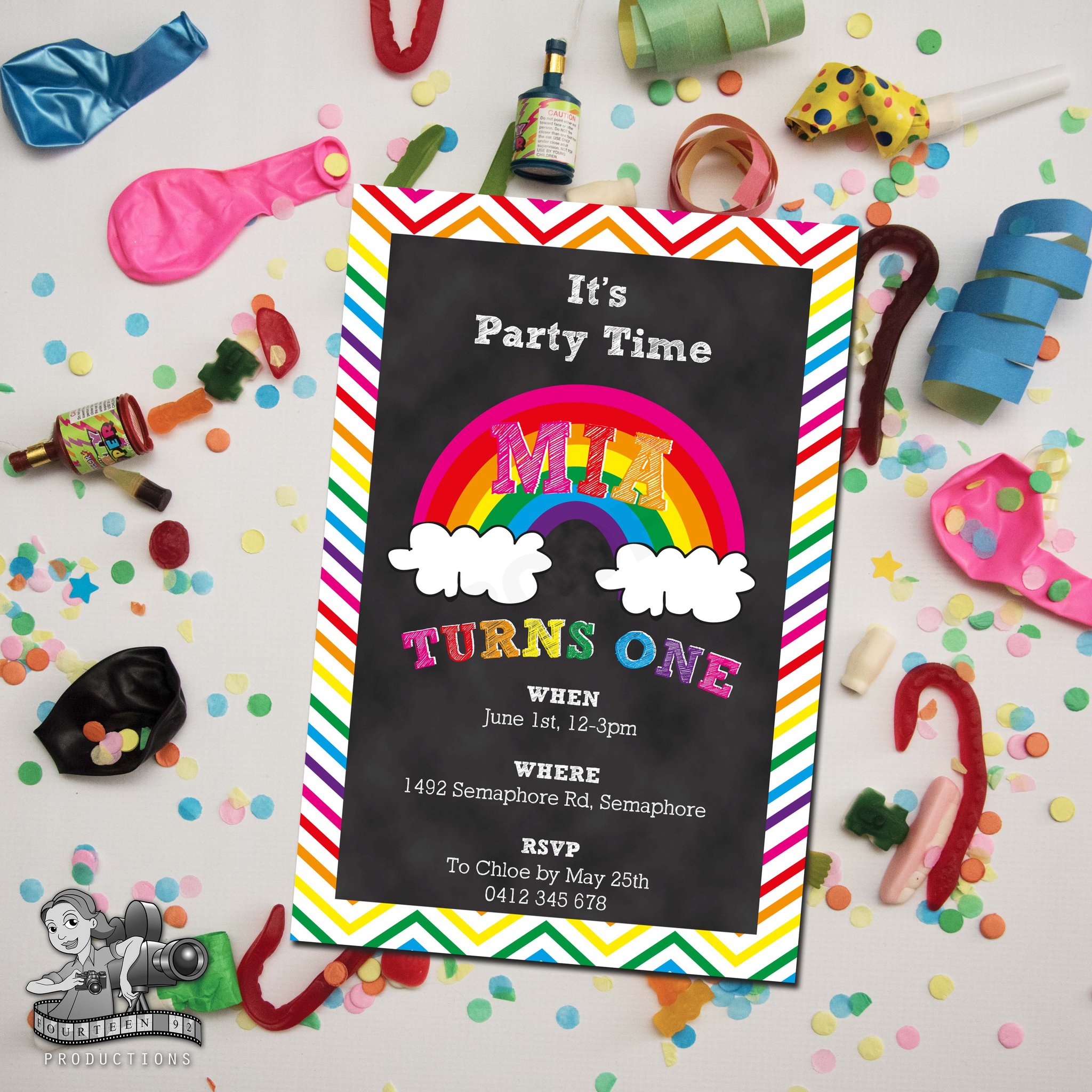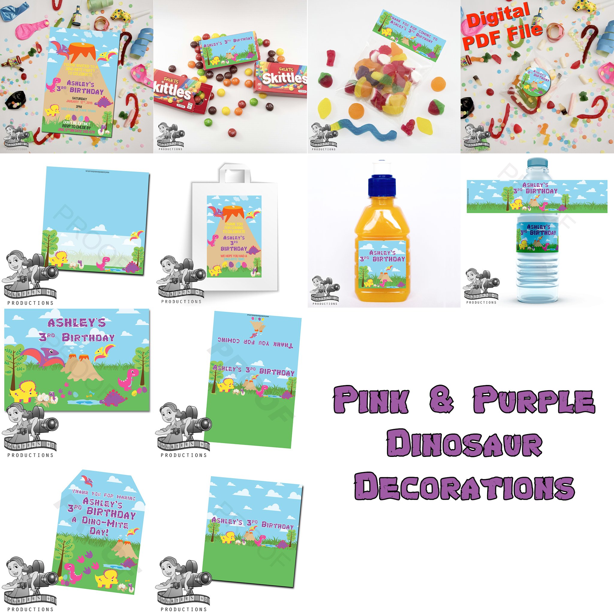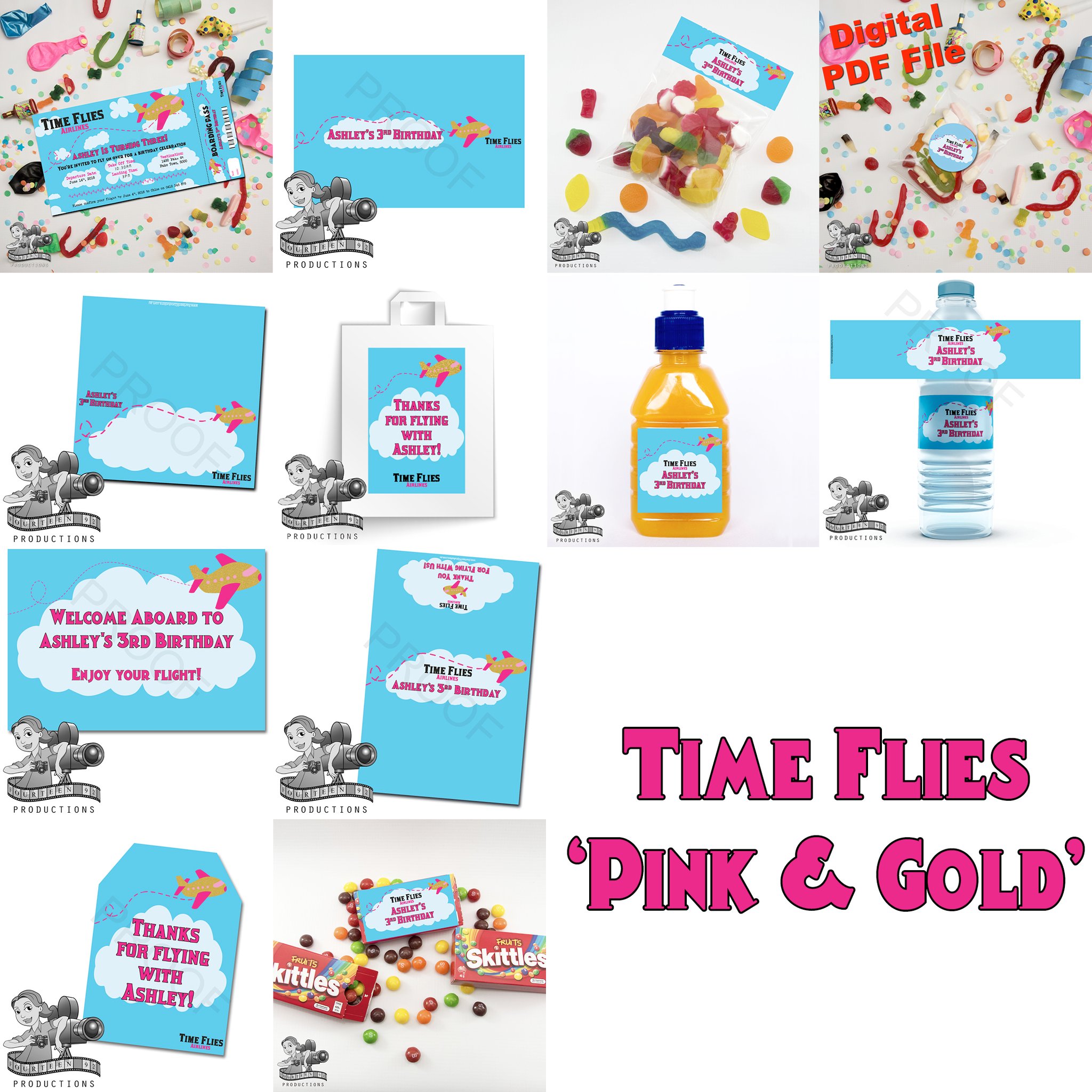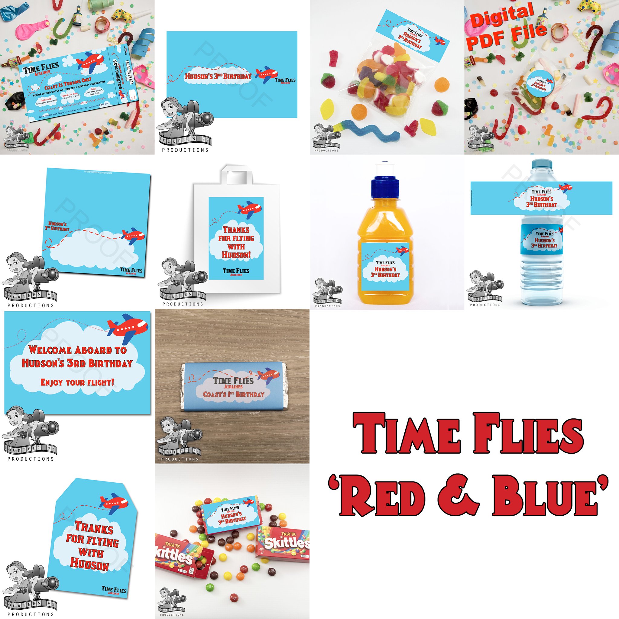 Invites (10x15cm Size) | Water Bottle Labels (350ml Size or 600ml Size) | Pop Top Labels (5x5cm size) | Chocolate Wrappers (Aldi 40g. or 200g Choc. Bars)