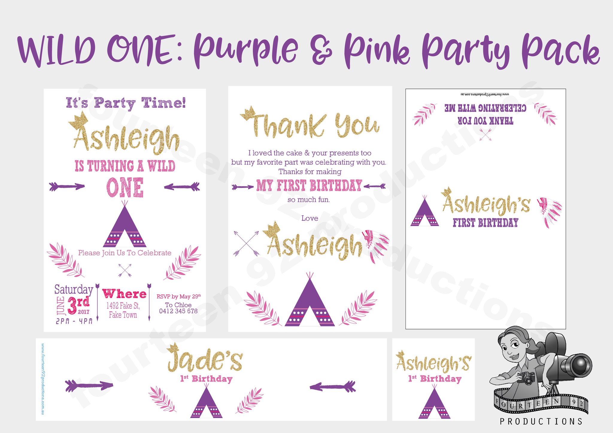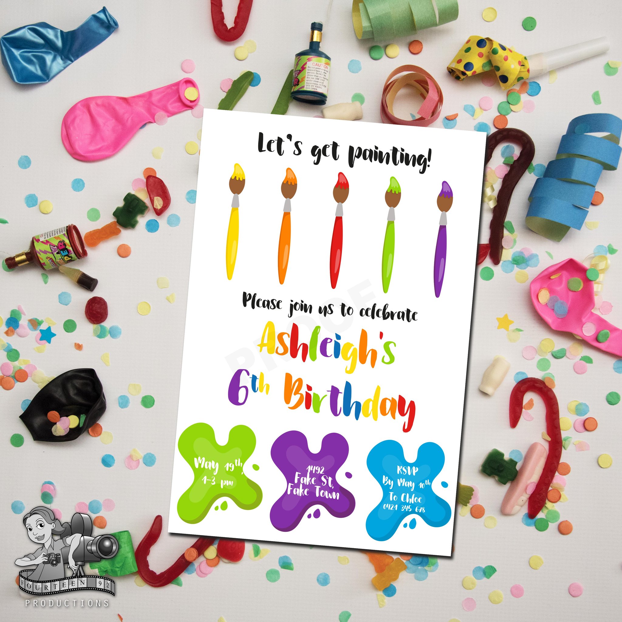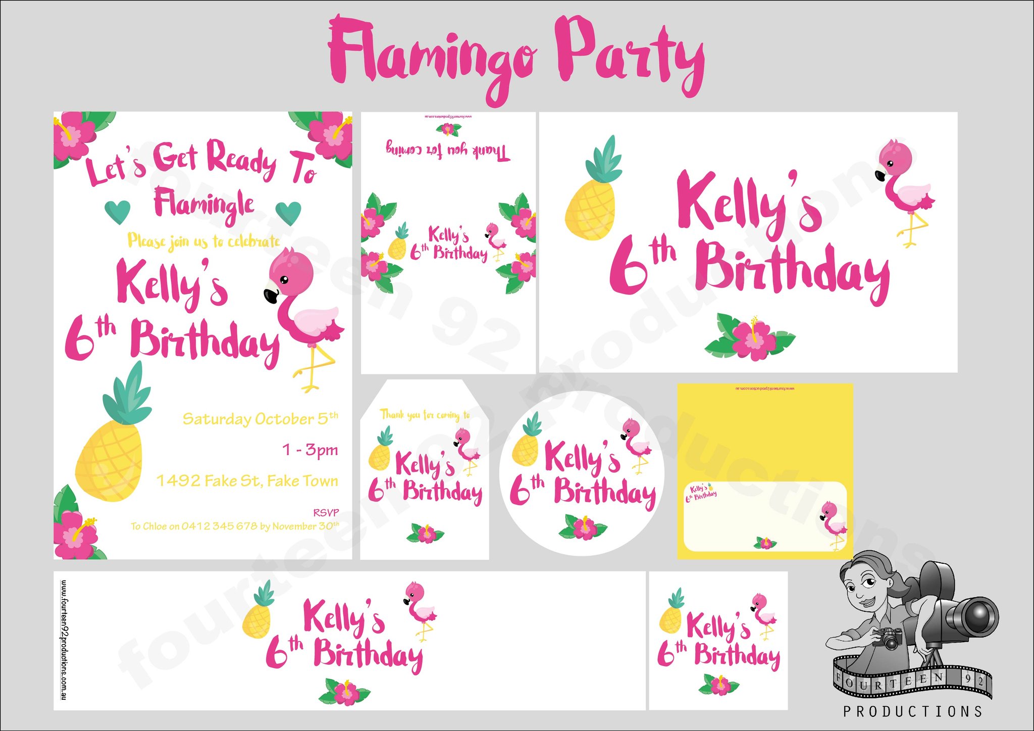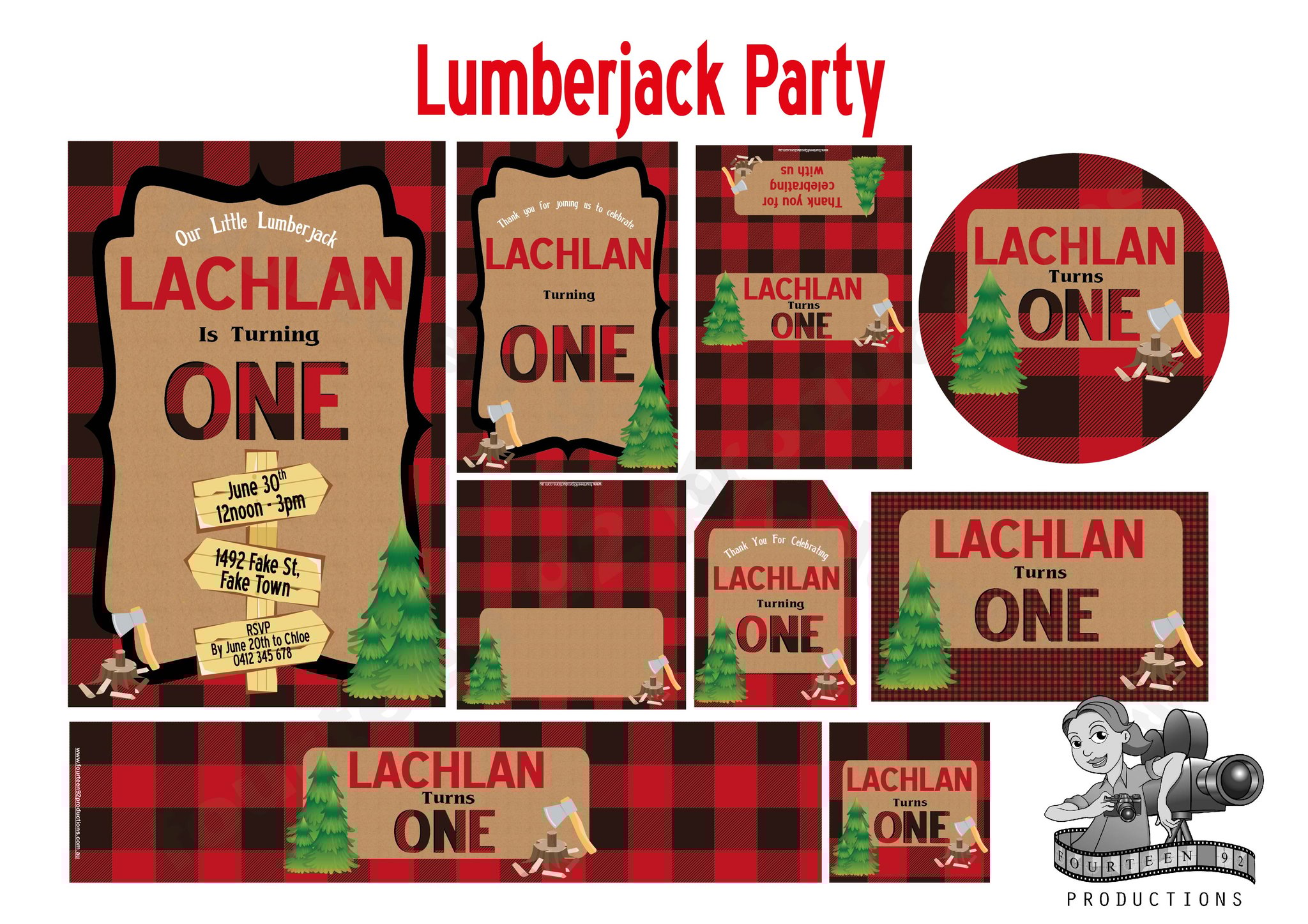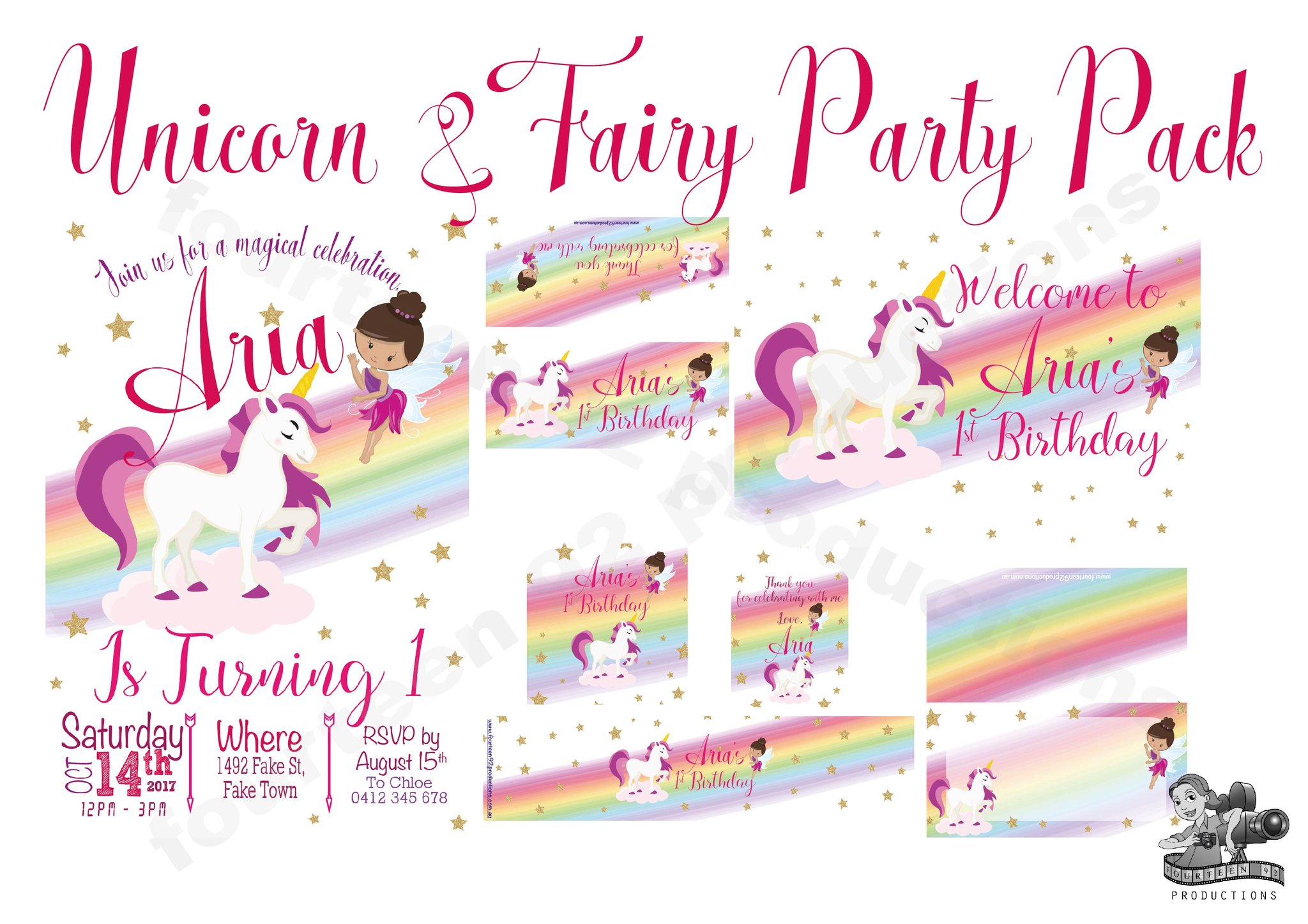 Invites (10x15cm Size) | Water Bottle Labels (350ml Size or 600ml Size) | Pop Top Labels (5x5cm size) | Chocolate Wrappers (Aldi 40g. or 200g Choc. Bars)