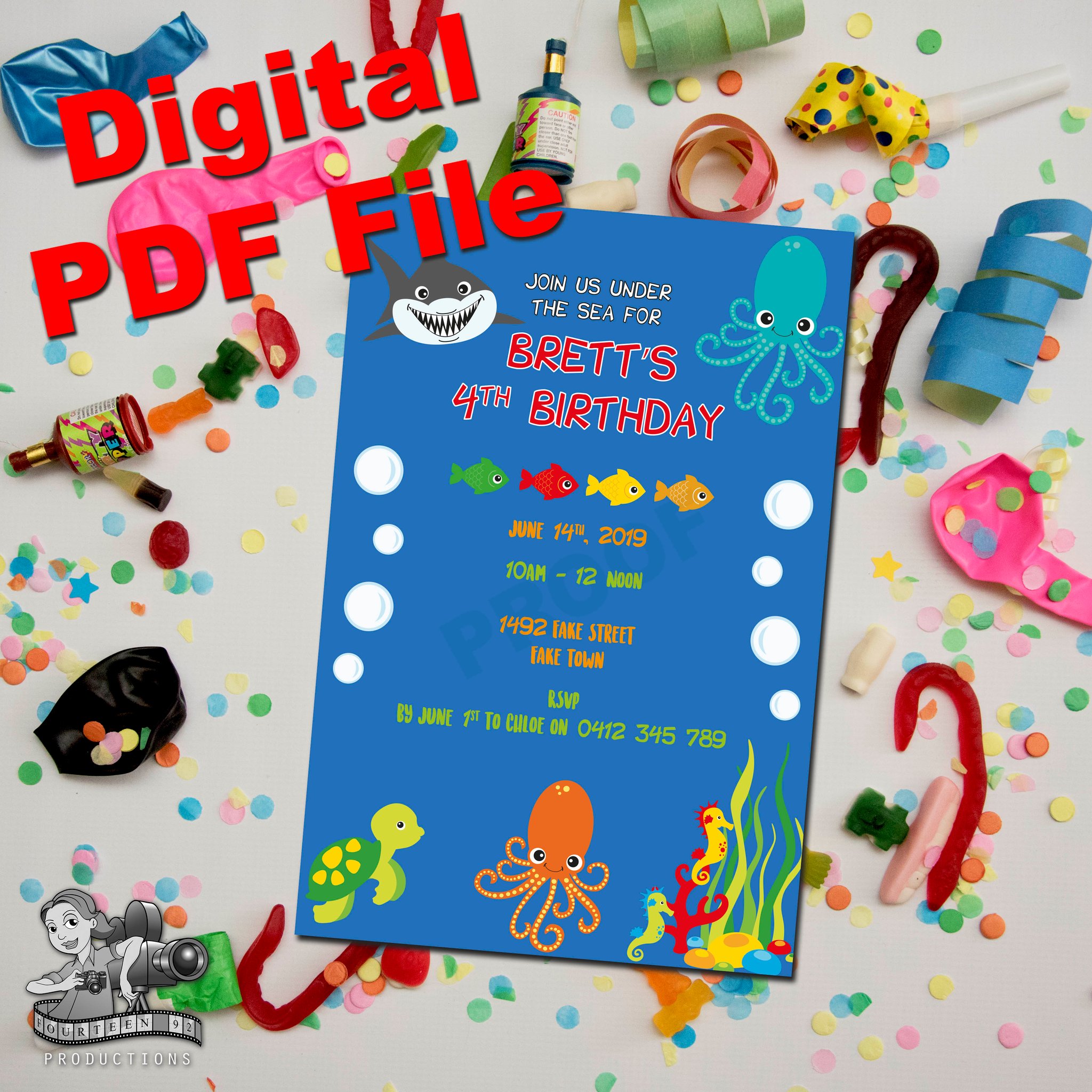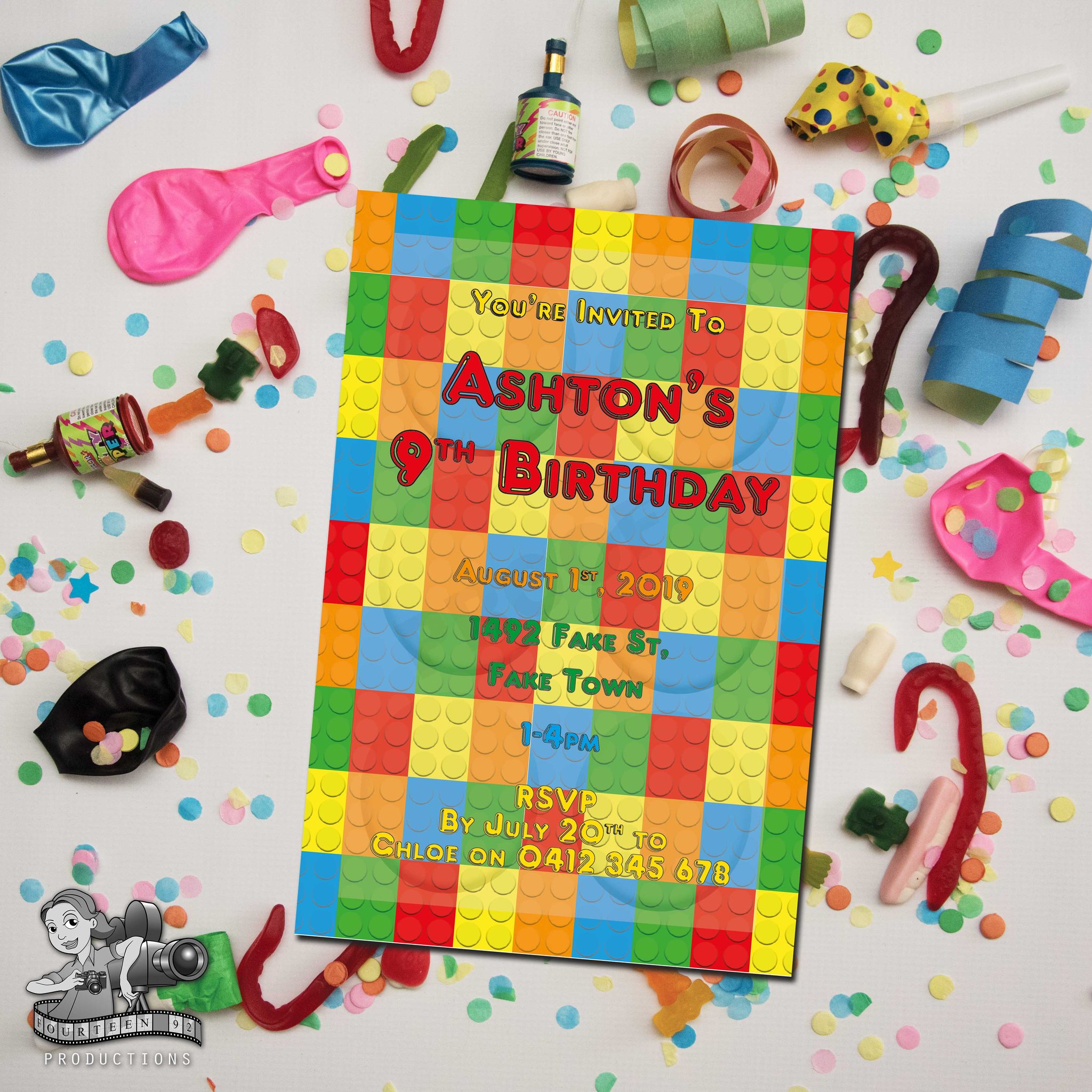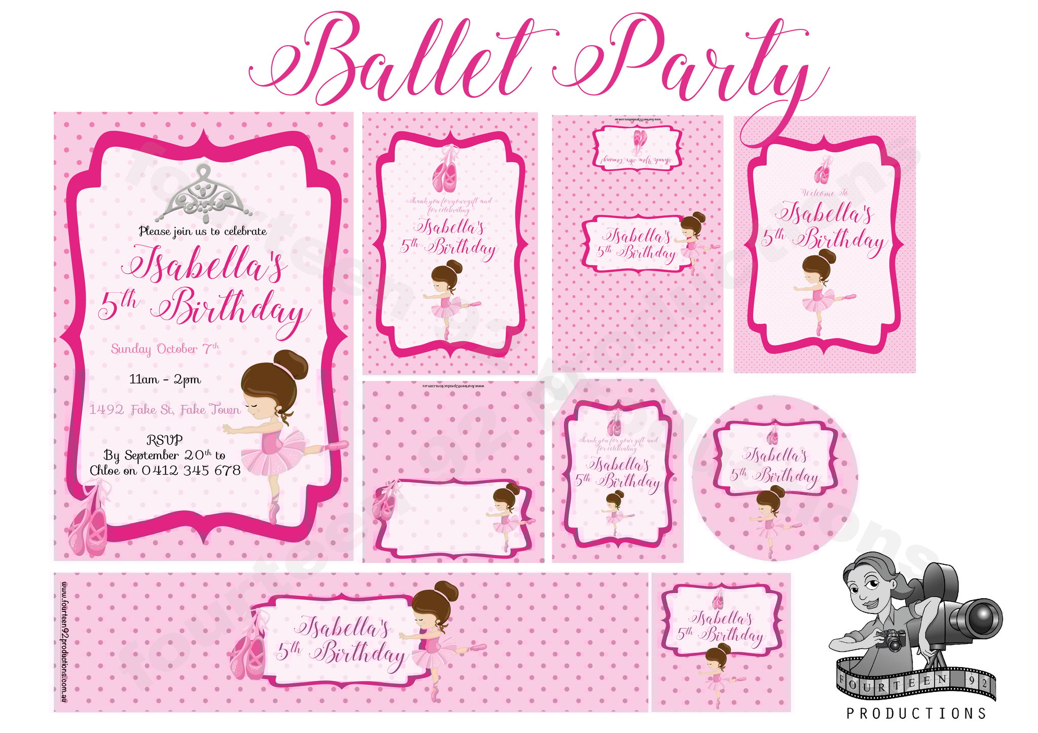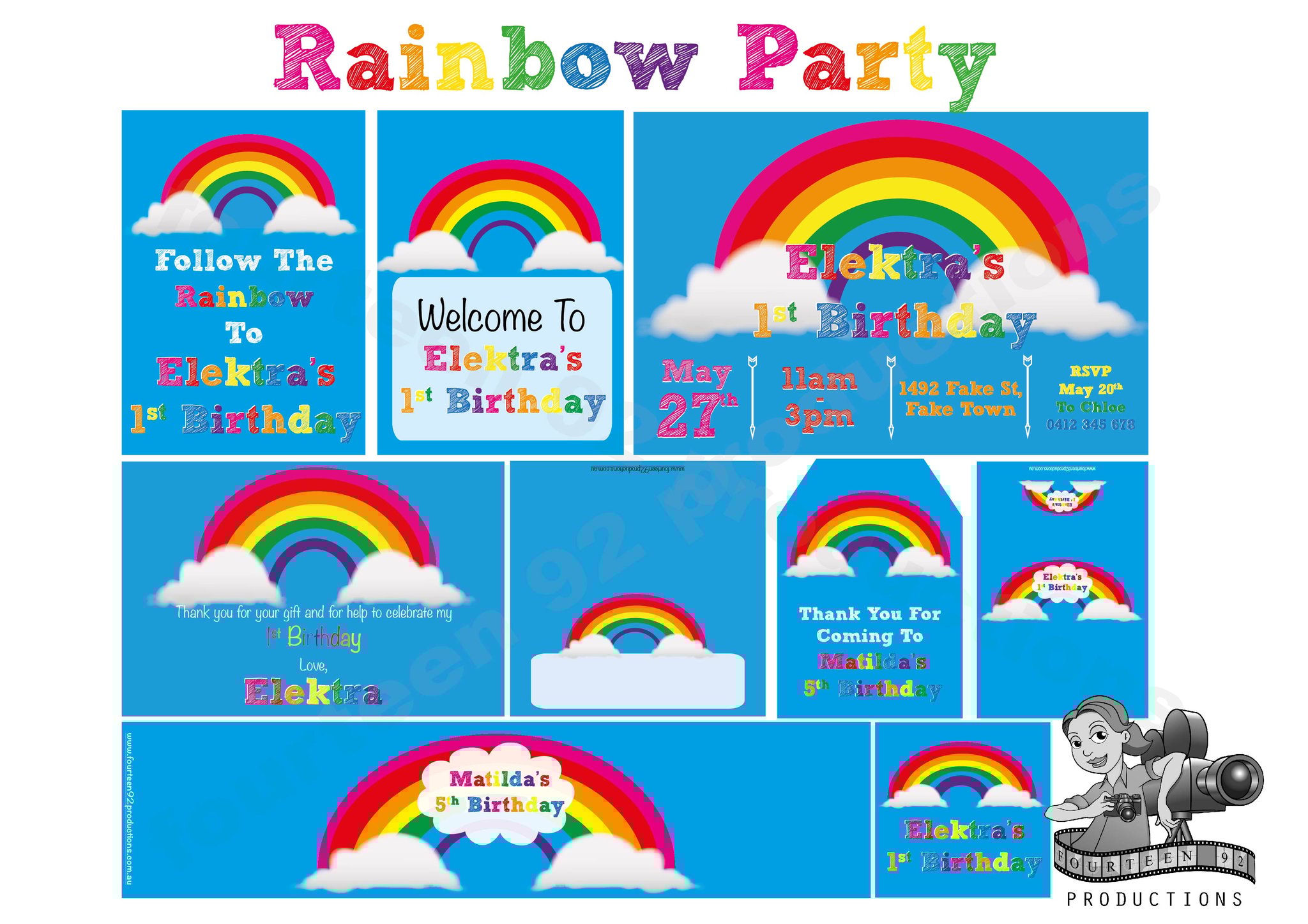 Invites (10x15cm Size) | Water Bottle Labels (350ml Size or 600ml Size) | Pop Top Labels (5x5cm size) | Chocolate Wrappers (Aldi 40g. or 200g Choc. Bars)