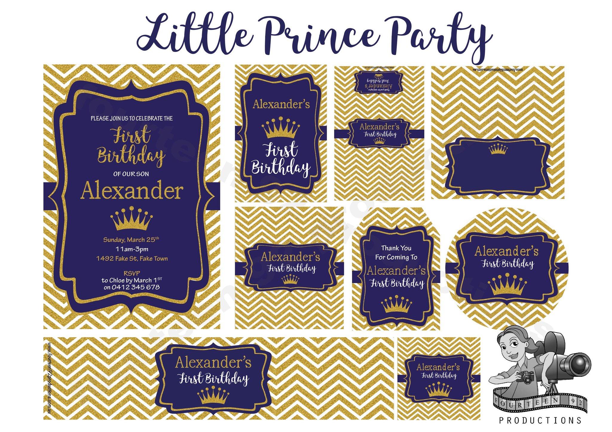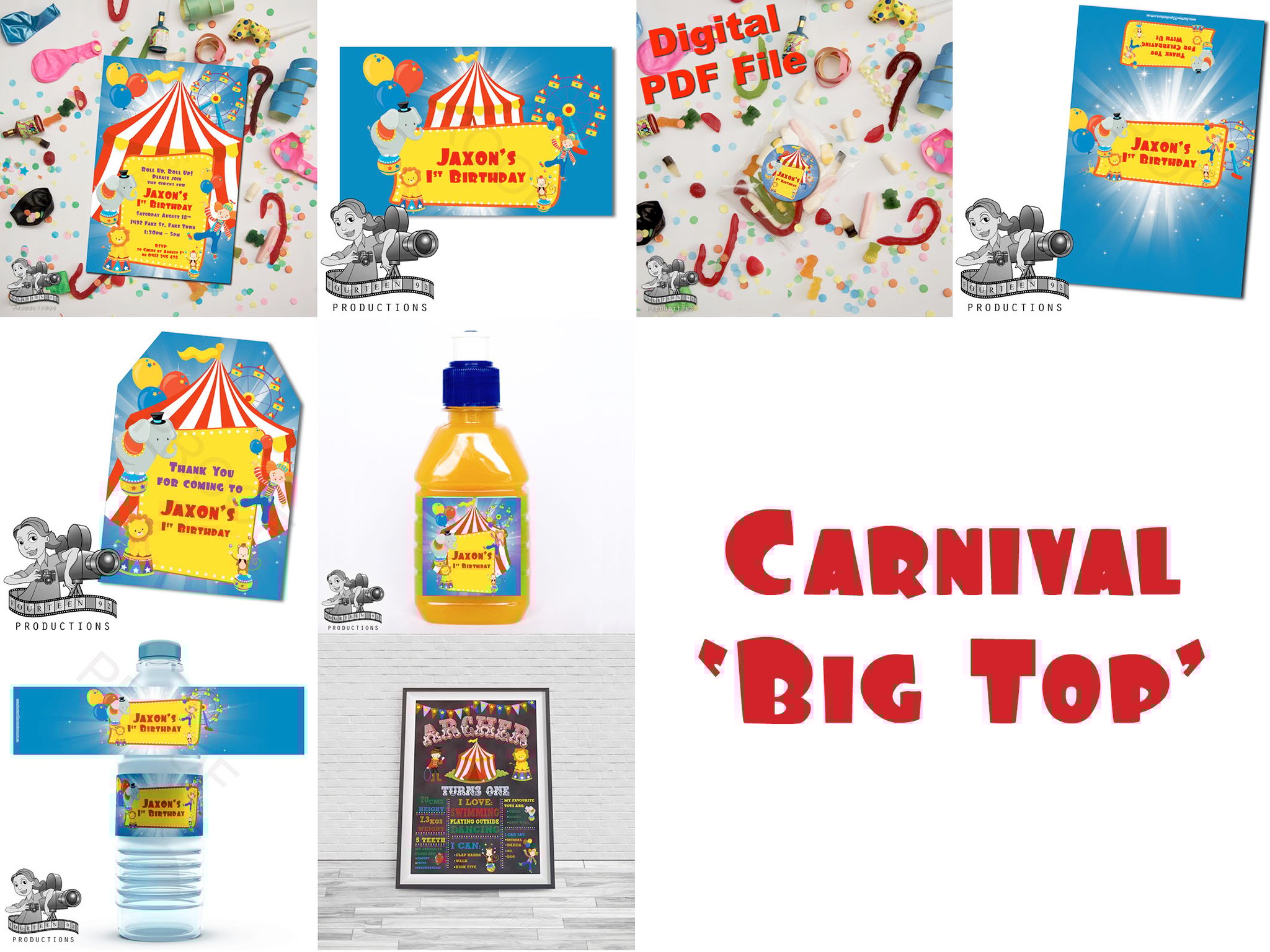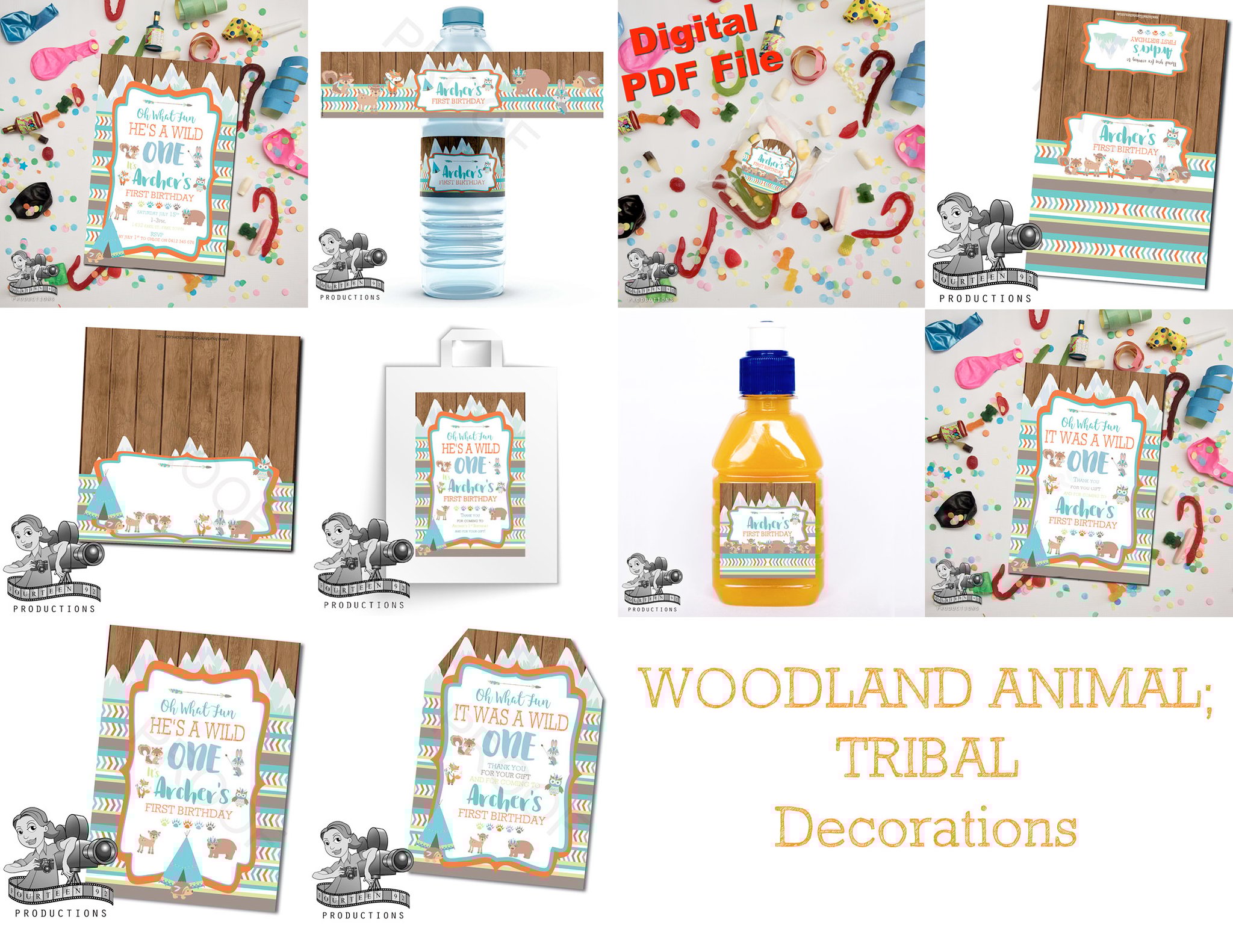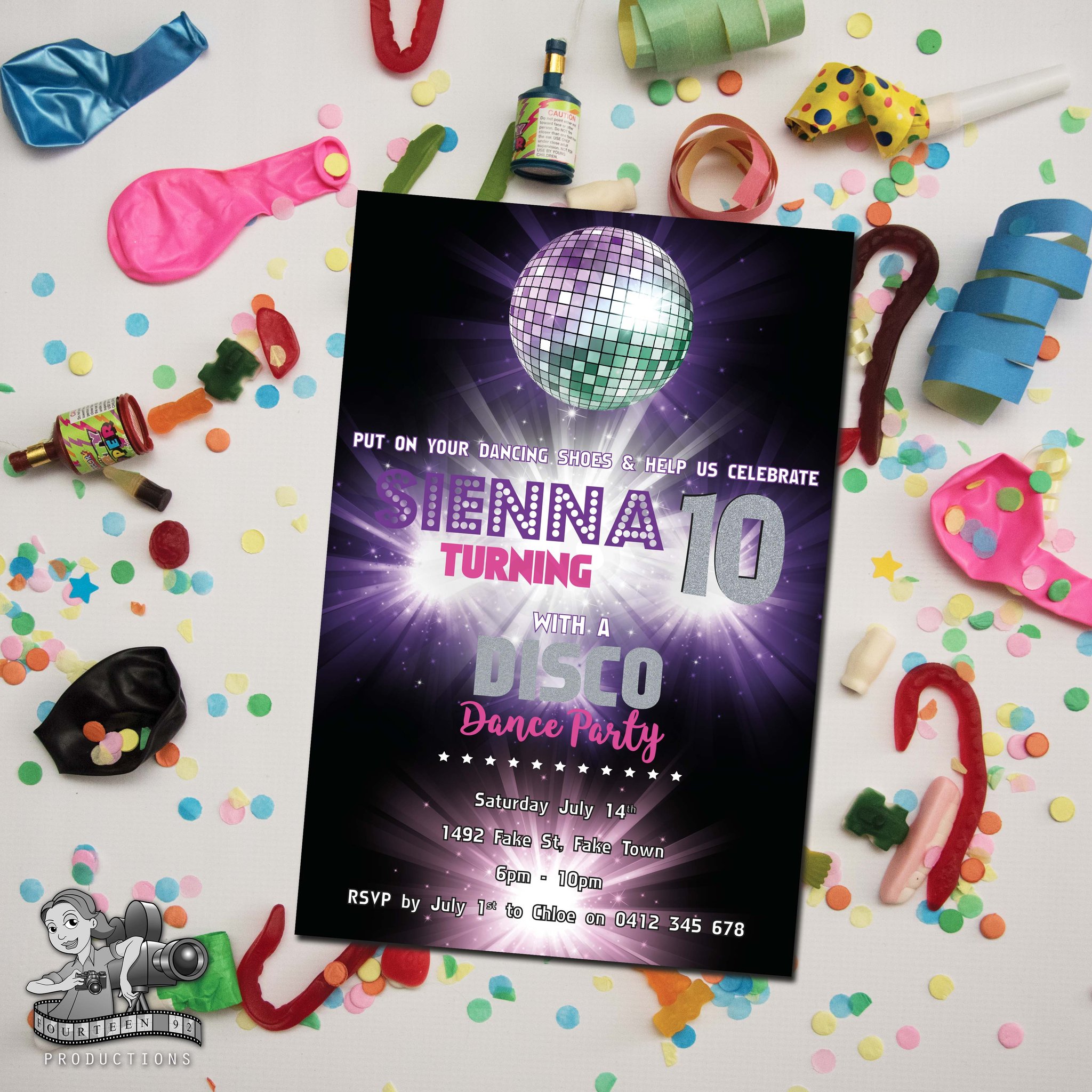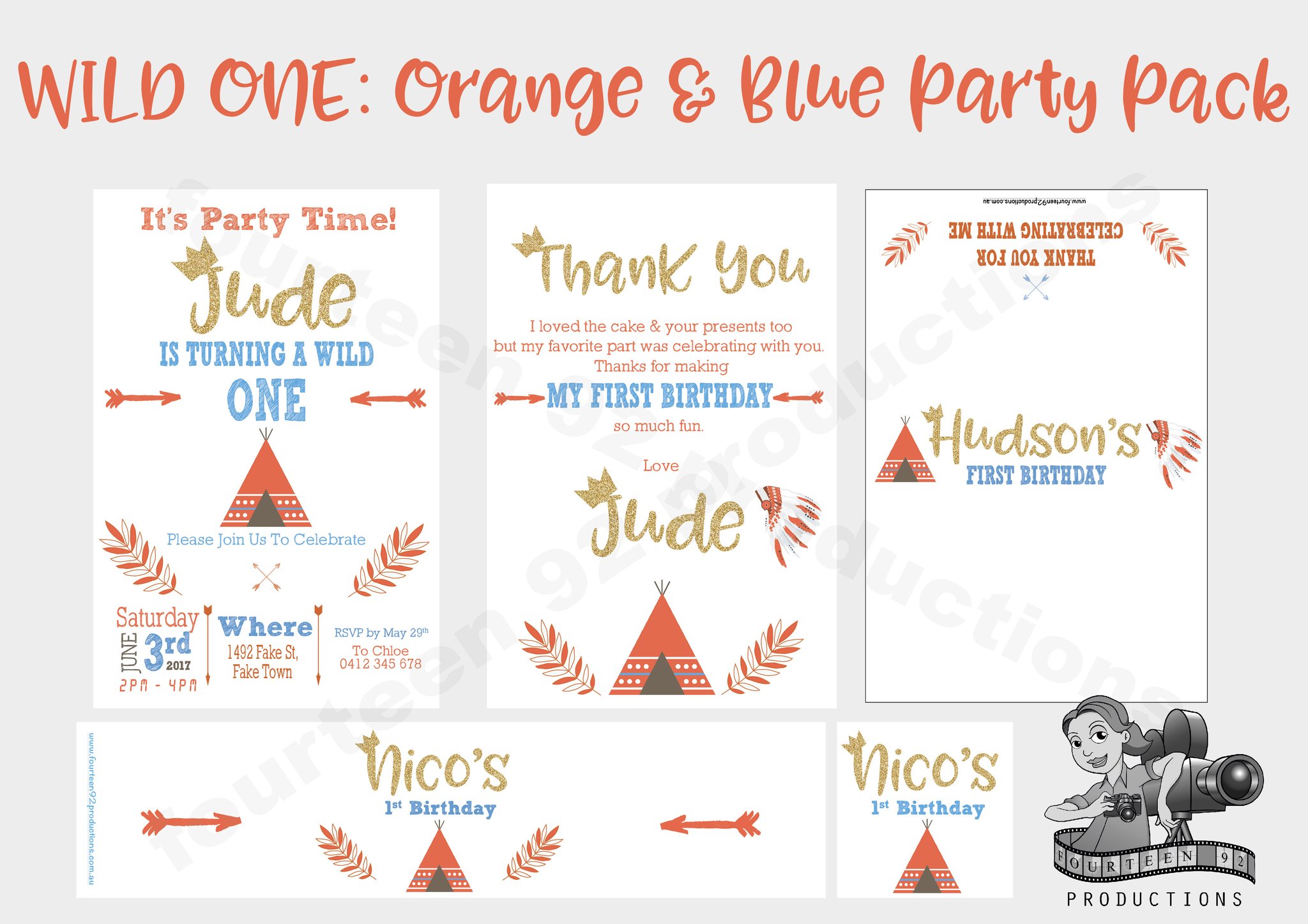 Invites (10x15cm Size) | Water Bottle Labels (350ml Size or 600ml Size) | Pop Top Labels (5x5cm size) | Chocolate Wrappers (Aldi 40g. or 200g Choc. Bars)